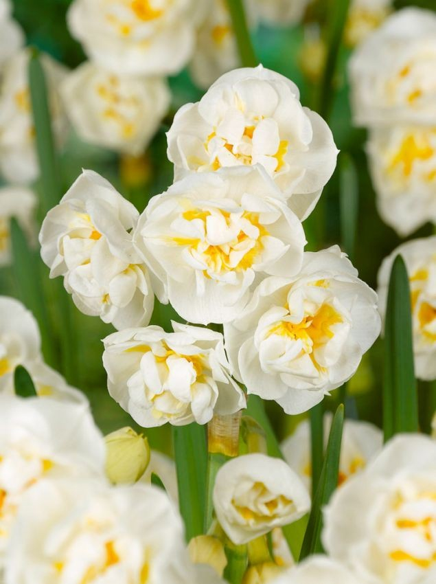 Descriere: Narcisa foarte apreciata, cu flori duble, delicate si parfumate. Florile apar in buchete de 3-6 pe fiecare tulpina, avand petale alb-crem iar in centru mici accente de galben-auriu, care dau un efect rafinat si festiv. Datorita aspectului sau , seamana cu o coroana de mireasa, de unde si numele. Are un parfum dulce si intens, fiind printre cele mai parfumate narcise.